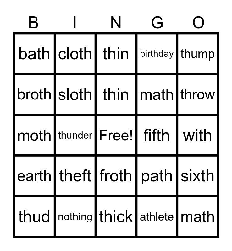 This bingo card has a free space and 25 words: theft, thick, thin, thud, thump, bath, broth, cloth, fifth, froth, math, moth, path, sixth, sloth, tenth, with, thin, throw, thunder, math, nothing, earth, birthday and athlete.