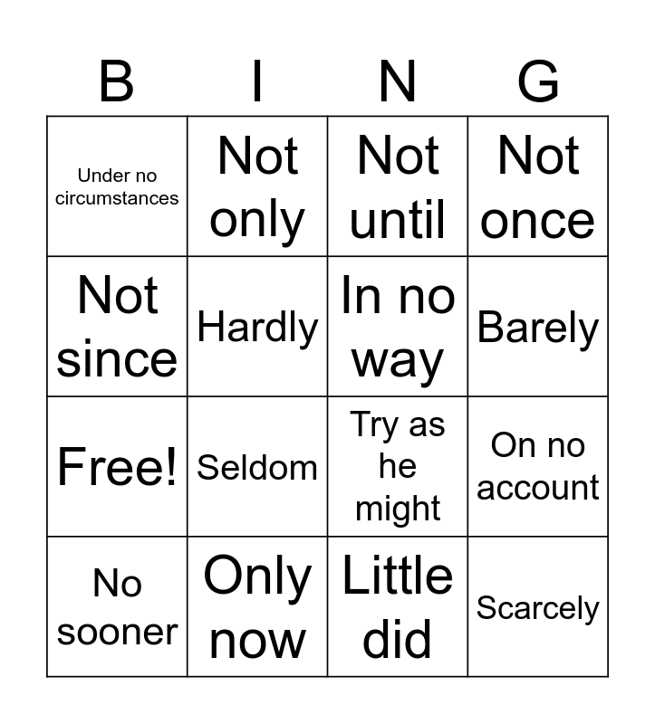 This bingo card has 20 words: On no account, Never have, Not until, Rarely, No sooner, Not since, Only now, Under no circumstances, Free!, Not only, Seldom, Try as he might, Hardly, Scarcely, In no way, Only after, Barely, Not once, Little did and Only when.