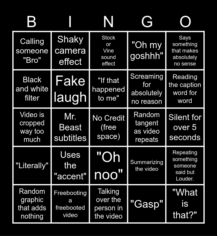 This bingo card has a free space and 24 words: Uses the "accent", Freebooting a freebooted video, "If that happened to me", Random graphic that adds nothing, Says something that makes absolutely no sense, Calling someone "Bro", Black and white filter, Shaky camera effect, Random tangent as video repeats, "Oh noo", Screaming for absolutely no reason, Video is cropped way too much, Summarizing the video, Repeating something someone said but Louder., Fake laugh, "Gasp", Silent for over 5 seconds, Stock or Vine sound effect, Reading the caption word for word, Mr. Beast subtitles, "What is that?", "Literally", "Oh my goshhh" and Talking over the person in the video.