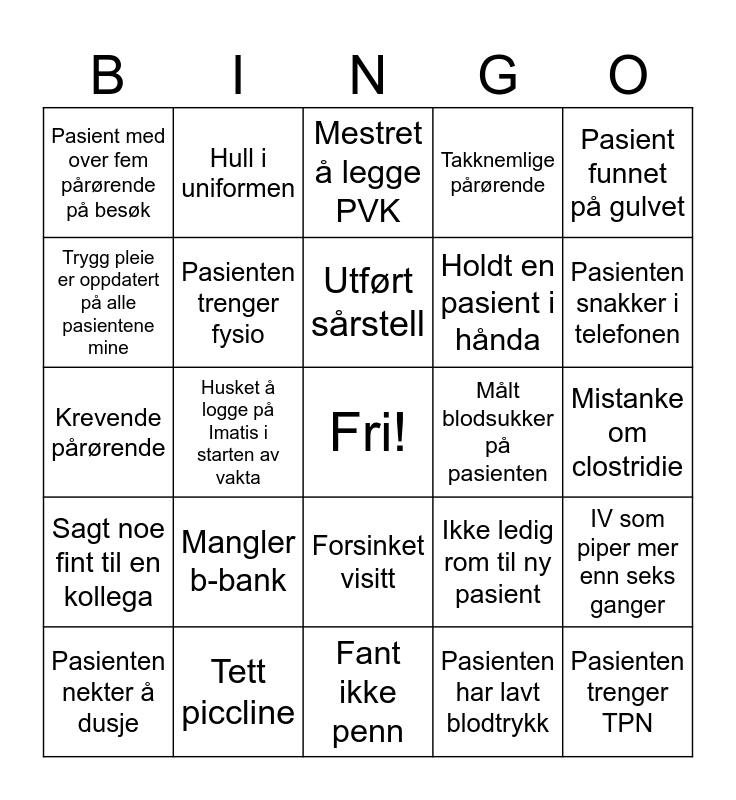 This bingo card has a free space and 71 words: Fikk veldig sein matpause, Hull i uniformen, Takknemlig pasient, Fant ikke legen, Fant ikke penn, Pasienten snorker, Takknemlige pårørende, Fant ikke pasienten, Holdt en pasient i hånda, Sa noe fint til kollega, Pasienten nekter å dusje, Avføring i seng, Pasienten snakker i telefonen, Pasient med over fem pårørende på besøk, Oppkast, Krevende pårørende, Ikke ledig rom til ny pasient, Pasient funnet på gulvet, Tomt for smittefrakker, Mistanke om clostridie, Mangler b-bank, Pasienten trenger TPN, IV som piper mer enn seks ganger, Pasienten har sonde, Pasienten er obstipert, Tomt for ekstra pute, Tomt for ekstra dyne, Legen gikk visitt uten sykepleier, Pasienten har lav KCL, Pasienten trenger SAG, Tett piccline, Tomt for kaffe i kanna, Teknisk feil på IV-apparat, Pasienten trenger trc, Pasienten har lavt blodtrykk, Pasienten trenger smertestillende, Det er opptatt på personaltoalettet, Dataen må startes på ny, Trygg pleie er oppdatert på alle pasientene mine, Pasienten vil ut og røyke, Forsinket visitt, Pasienten har feber, Sagt noe fint til en kollega, Kollega med øredobber, Kollega med klokke på, Pasienten gikk en runde i korridoren, Bommet på PVK, Pasienten trenger fysio, Kollega glemte å finne frem antibiotika, Kollega glemte å bestille riktig medisin, Kollega sa god påske, Glemt å bestille portør, Målt blodsukker på pasienten, Tok med feil medisin eller til feil tid, Blodflekk/kaffeflekk på uniform, Utålmodig pasient, Utført sårstell, Spist av restene etter pasientfrokosten, Assistert ved beinmarg, Skiftet bandasje på piccline, Kollega tok klokke for deg, uoppfordret, Tok klokke uoppfordret for kollega, Husket å logge på Imatis i starten av vakta, Data tom for batteri, Hadde et godt forslag til en kollega, Mistet utstyr på gulvet, Mestret å legge PVK, Pasienten gikk på stua i pysj, Glemte å logge på Imatis i starten av vakta, Husket å tilby pasienten morgenkåpe før stua and Glemte å ta blodsukker før måltid.