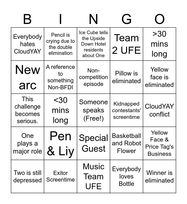 This bingo card has a free space and 24 words: Pen & Liy, Exitor Screentime, Non-competition episode, Two is still depressed, >30 mins long, Everybody hates CloudYAY, New arc, Pencil is crying due to the double elimination, Kidnapped contestants' screentime, Special Guest, Pillow is eliminated, This challenge becomes serious., Basketball and Robot Flower, Yellow Face & Price Tag's Business, A reference to something Non-BFDI, Everybody loves Bottle, CloudYAY conflict, Ice Cube tells the Upside Down Hotel residents about One, Yellow face is eliminated, <30 mins long, Winner is eliminated, One plays a major role, Team 2 UFE and Music Team UFE.