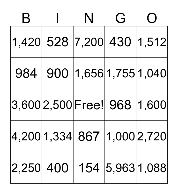 This bingo card has a free space and 24 words: 1,334, 400, 1,656, 2,250, 1,512, 1,420, 984, 528, 968, 867, 1,755, 3,600, 1,000, 2,720, 900, 5,963, 1,600, 7,200, 1,040, 2,500, 1,088, 4,200, 430 and 154.