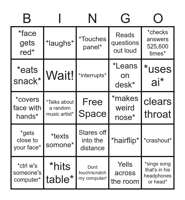 This bingo card has a free space and 37 words: *gets close to your face*, *plays games on computer or phone*, *walks around*, *uses ai*, *eats snack*, *texts somone*, *Touches panel*, No no (but) like, *checks answers 525,600 times*, *ctrl w's someone's computer*, *Talks about a random music artist*, *makes weird nose*, *crashout*, Dont touch/scratch my computer!, *hairflip*, *sings song that's in his headphones or head*, *takes out phone*, *Leans on desk*, *accidently makes offensive comment*, *face gets red*, *laughs*, *interrupts*, Stop!, Brooooooo, *puts hand over his mouth*, *hits table*, Reads questions out loud, *cheats*, *drinks water*, Sits on counter, *leans back in chair*, *covers face with hands*, Wait!, Stares off into the distance, Yells across the room, clears throat and Yapping.