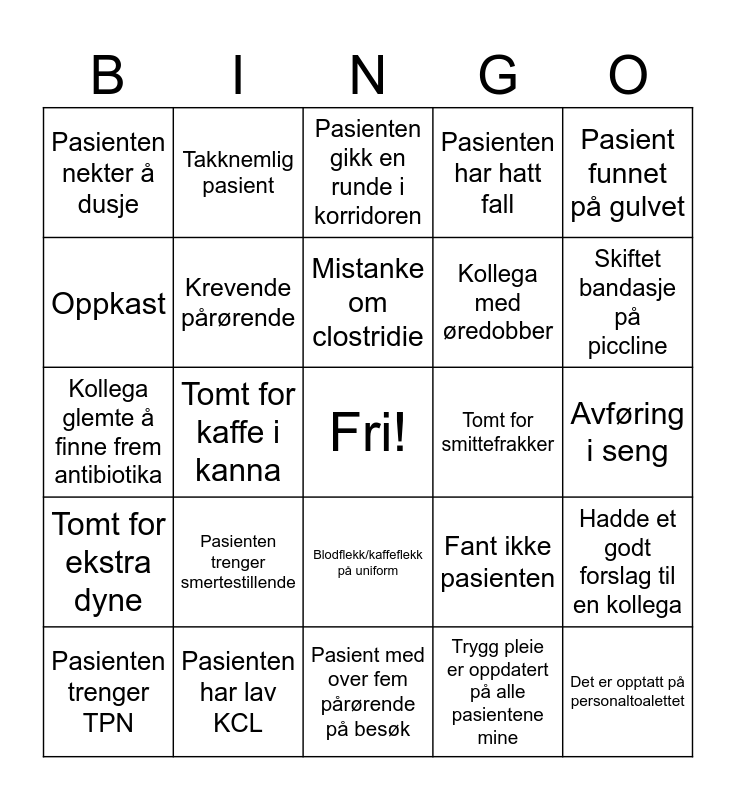 This bingo card has a free space and 73 words: Fikk veldig sein matpause, Hull i uniformen, Pasienten nekter å dusje, Takknemlig pasient, Fant ikke legen, Pasienten snorker, Tomt for ekstra dyne, Takknemlige pårørende, Fant ikke pasienten, Holdt en pasient i hånda, Fant ikke penn, Sa noe fint til kollega, Krevende pårørende, Avføring i seng, Pasienten snakker i telefonen, Takknemlig pasient, Pasient med over fem pårørende på besøk, Oppkast, Ikke ledig rom til ny pasient, Tomt for smittefrakker, Mistanke om clostridie, Pasienten har hatt fall, Pasient funnet på gulvet, Mangler b-bank, Pasienten trenger TPN, IV som piper mer enn seks ganger, Pasienten har sonde, Pasienten er obstipert, Tomt for ekstra pute, Legen gikk visitt uten sykepleier, Pasienten har lav KCL, Pasienten trenger SAG, Pasienten vil ut og røyke, Tett piccline, Tomt for kaffe i kanna, Teknisk feil på IV-apparat, Pasienten trenger trc, Pasienten har lavt blodtrykk, Det er opptatt på personaltoalettet, Dataen må startes på ny, Trygg pleie er oppdatert på alle pasientene mine, Pasienten trenger smertestillende, Forsinket visitt, Pasienten har feber, Sagt noe fint til en kollega, Kollega med øredobber, Pasienten gikk en runde i korridoren, Bommet på PVK, Pasienten trenger fysio, Kollega glemte å finne frem antibiotika, Mestret å legge PVK, Kollega med klokke på, Kollega sa god påske, Kollega glemte å bestille riktig medisin, Glemt å bestille portør, Målt blodsukker på pasienten, Tok med feil medisin eller til feil tid, Blodflekk/kaffeflekk på uniform, Utålmodig pasient, Glemte å ta blodsukker før måltid, Utført sårstell, Spist av restene etter pasientfrokosten, Assistert ved beinmarg, Skiftet bandasje på piccline, Kollega tok klokke for deg, uoppfordret, Tok klokke uoppfordret for kollega, Husket å logge på Imatis i starten av vakta, Data tom for batteri, Hadde et godt forslag til en kollega, Mistet utstyr på gulvet, Pasienten gikk på stua i pysj, Glemte å logge på Imatis i starten av vakta and Husket å tilby pasienten morgenkåpe før stua.