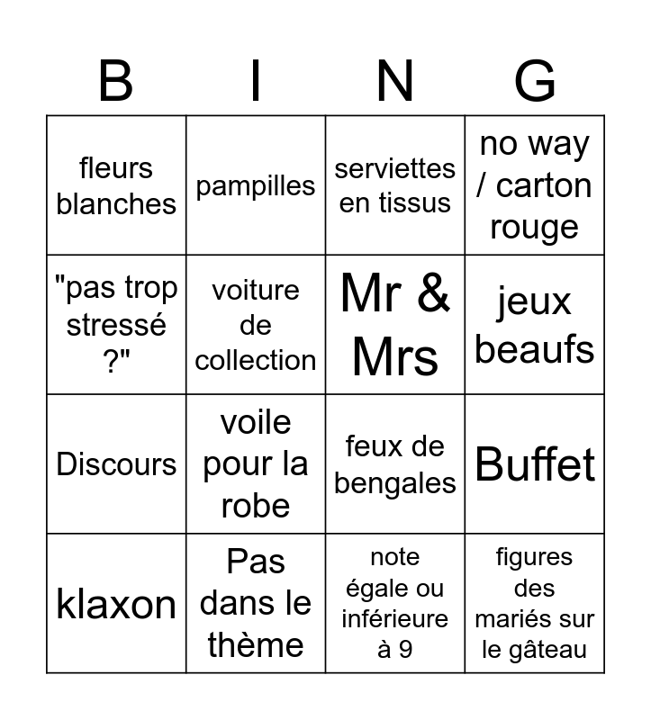 This bingo card has 16 words: Pas dans le thème, Buffet, serviettes en tissus, fleurs blanches, Discours, pampilles, feux de bengales, note égale ou inférieure à 9, "pas trop stressé ?", voiture de collection, klaxon, no way / carton rouge, voile pour la robe, jeux beaufs, Mr & Mrs and figures des mariés sur le gâteau.