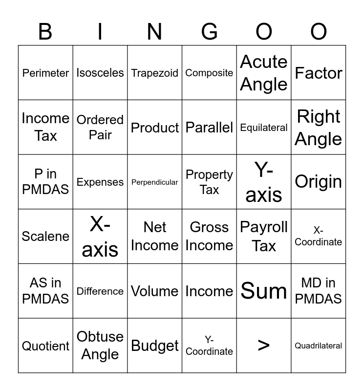 This bingo card has 42 words: >, Ordered Pair, Quadrants, Y-axis, X-Coordinate, X-axis, P in PMDAS, Coordinate Plane, Trapezoid, Origin, Perpendicular, Parallel, Right Angle, Acute Angle, Obtuse Angle, Scalene, MD in PMDAS, Equilateral, Quadrilateral, Isosceles, Factor, Volume, AS in PMDAS, Perimeter, Area, Quotient, Product, <, Difference, Sum, Sales Tax, Property Tax, Income Tax, Payroll Tax, Budget, Net Income, Gross Income, Expenses, Income, Y-Coordinate, Composite and Prime.