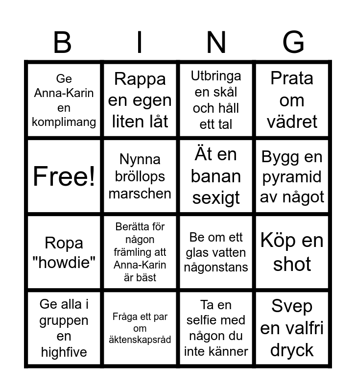 This bingo card has 16 words: Fråga ett par om äktenskapsråd, Köp en shot, Utbringa en skål och håll ett tal, Ge Anna-Karin en komplimang, Ropa "howdie", Rappa en egen liten låt, Be om ett glas vatten någonstans, Ta en selfie med någon du inte känner, Free!, Nynna bröllops marschen, Ge alla i gruppen en highfive, Prata om vädret, Berätta för någon främling att Anna-Karin är bäst, Bygg en pyramid av något, Ät en banan sexigt and Svep en valfri dryck.