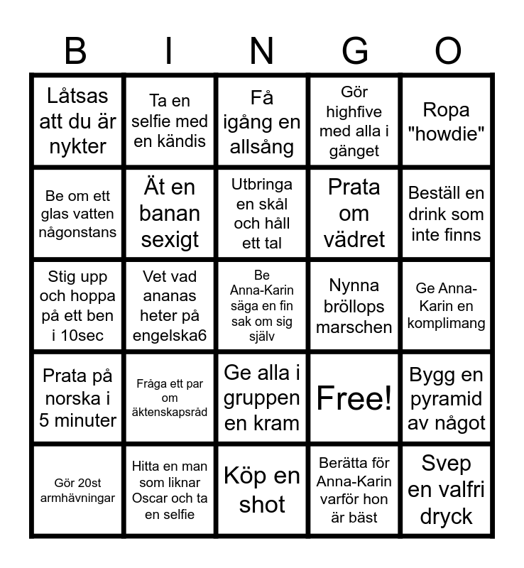 This bingo card has 25 words: Fråga ett par om äktenskapsråd, Köp en shot, Utbringa en skål och håll ett tal, Gör 20st armhävningar, Ropa "howdie", Låtsas att du är nykter, Be om ett glas vatten någonstans, Ta en selfie med en kändis, Nynna bröllops marschen, Ge alla i gruppen en kram, Prata om vädret, Stig upp och hoppa på ett ben i 10sec, Free!, Bygg en pyramid av något, Ät en banan sexigt, Svep en valfri dryck, Ge Anna-Karin en komplimang, Få igång en allsång, Beställ en drink som inte finns, Vet vad ananas heter på engelska6, Be Anna-Karin säga en fin sak om sig själv, Hitta en man som liknar Oscar och ta en selfie, Prata på norska i 5 minuter, Gör highfive med alla i gänget and Berätta för Anna-Karin varför hon är bäst.