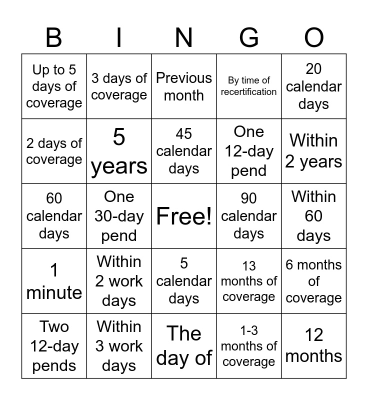 This bingo card has a free space and 24 words: Within 2 work days, Within 3 work days, 45 calendar days, Two 12-day pends, 20 calendar days, Up to 5 days of coverage, 2 days of coverage, 3 days of coverage, 90 calendar days, 5 calendar days, One 12-day pend, 60 calendar days, 13 months of coverage, 6 months of coverage, 5 years, 1-3 months of coverage, Within 60 days, Previous month, Within 2 years, One 30-day pend, 12 months, 1 minute, By time of recertification and The day of.