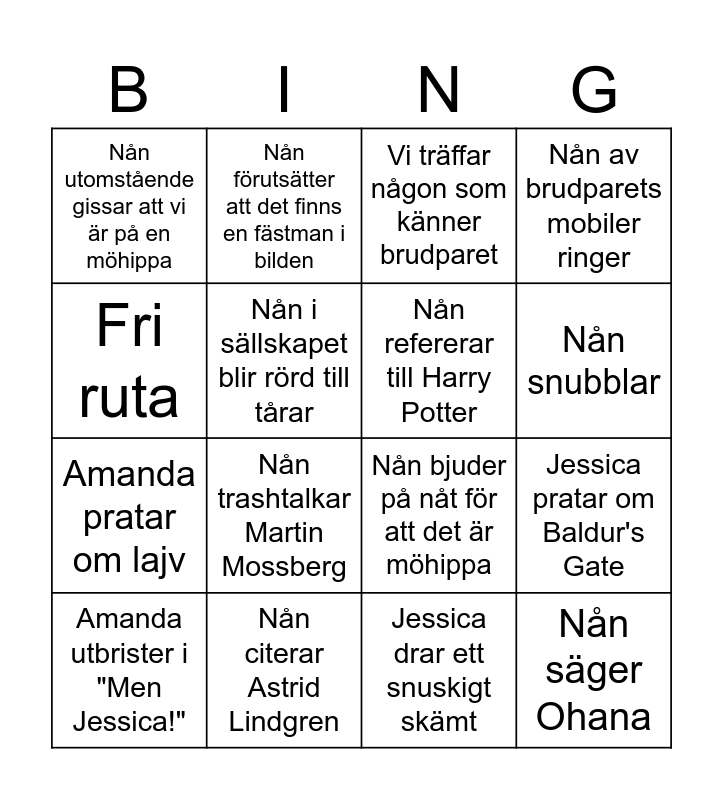 This bingo card has 16 words: Nån citerar Astrid Lindgren, Jessica pratar om Baldur's Gate, Vi träffar någon som känner brudparet, Nån utomstående gissar att vi är på en möhippa, Amanda pratar om lajv, Nån förutsätter att det finns en fästman i bilden, Nån bjuder på nåt för att det är möhippa, Jessica drar ett snuskigt skämt, Fri ruta, Nån i sällskapet blir rörd till tårar, Amanda utbrister i "Men Jessica!", Nån av brudparets mobiler ringer, Nån trashtalkar Martin Mossberg, Nån snubblar, Nån refererar till Harry Potter and Nån säger Ohana.