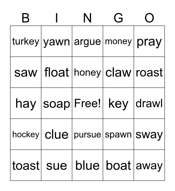 This bingo card has a free space and 24 words: clue, sue, honey, toast, pray, turkey, saw, yawn, key, pursue, claw, hay, spawn, sway, float, boat, drawl, argue, roast, soap, away, hockey, money and blue.