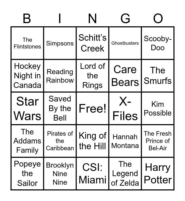 This bingo card has a free space and 40 words: The Jeffersons, Star Wars, Big Bang Theory, Reading Rainbow, Brooklyn Nine Nine, King of the Hill, Lord of the Rings, Pokémon, Scooby-Doo, The Addams Family, Saved By the Bell, Ghostbusters, Harry Potter, Kim Possible, X-Files, Pirates of the Caribbean, I Dream of Jeannie, The Flintstones, Seinfeld, Schitt’s Creek, The Fresh Prince of Bel-Air, The Legend of Zelda, Care Bears, Hockey Night in Canada, Stranger Things, Two and a Half Men, That’s So Raven, The Lion King, Barney, Looney Tunes, Brady Bunch, Popeye the Sailor, Malcolm in the Middle, Hannah Montana, The Smurfs, CSI: Miami, The Fairly Odd Parents, Gilligan’s Island, Simpsons and Spiderman.