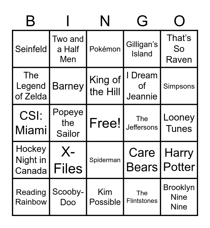 This bingo card has a free space and 40 words: Lord of the Rings, CSI: Miami, The Addams Family, Barney, Scooby-Doo, Spiderman, King of the Hill, The Fairly Odd Parents, That’s So Raven, Hockey Night in Canada, Popeye the Sailor, Gilligan’s Island, Brooklyn Nine Nine, Looney Tunes, The Jeffersons, X-Files, The Smurfs, Seinfeld, Ghostbusters, Pokémon, Harry Potter, The Flintstones, I Dream of Jeannie, The Legend of Zelda, The Lion King, Big Bang Theory, Saved By the Bell, The Fresh Prince of Bel-Air, Brady Bunch, Star Wars, Pirates of the Caribbean, Reading Rainbow, Stranger Things, Care Bears, Simpsons, Kim Possible, Hannah Montana, Malcolm in the Middle, Two and a Half Men and Schitt’s Creek.