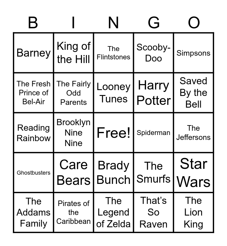 This bingo card has a free space and 40 words: Big Bang Theory, Reading Rainbow, Gilligan’s Island, The Fairly Odd Parents, Pirates of the Caribbean, Brady Bunch, Looney Tunes, Pokémon, Simpsons, Ghostbusters, Brooklyn Nine Nine, Scooby-Doo, The Lion King, The Jeffersons, Spiderman, Care Bears, CSI: Miami, Barney, I Dream of Jeannie, The Flintstones, Star Wars, That’s So Raven, Harry Potter, The Fresh Prince of Bel-Air, Stranger Things, Kim Possible, Two and a Half Men, Seinfeld, Schitt’s Creek, Hannah Montana, Malcolm in the Middle, The Addams Family, Popeye the Sailor, The Smurfs, Saved By the Bell, The Legend of Zelda, Lord of the Rings, Hockey Night in Canada, King of the Hill and X-Files.