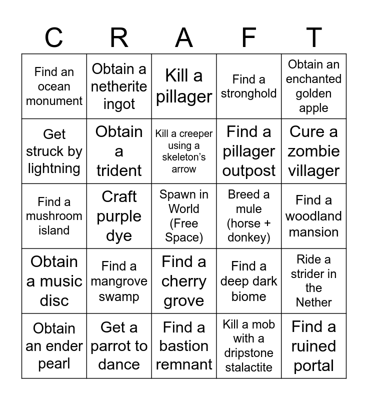This bingo card has a free space and 33 words: Craft a cake, Craft a firework rocket, Craft purple dye, Obtain a golden apple, Obtain a music disc, Obtain a trident, Obtain an enchanted golden apple, Obtain an ender pearl, Obtain a netherite ingot, Obtain a totem of undying, Kill a creeper using a skeleton’s arrow, Kill a pillager, Kill a warden, Kill a ghast and get its tear, Breed a mule (horse + donkey), Cure a zombie villager, Get a parrot to dance, Find a mushroom island, Find a mangrove swamp, Find a deep dark biome, Find a cherry grove, Find a badlands biome, Find an ocean monument, Find a woodland mansion, Find a bastion remnant, Find a ruined portal, Find a stronghold, Find a pillager outpost, Get struck by lightning, Ride a strider in the Nether, Survive a fall of 50+ blocks, Kill a mob with a dripstone stalactite and Make an iron golem.