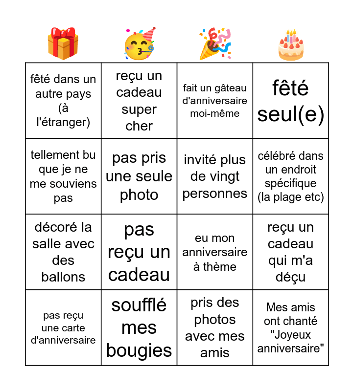 This bingo card has 16 words: soufflé mes bougies, reçu un cadeau qui m'a déçu, fait un gâteau d'anniversaire moi-même, fêté dans un autre pays (à l'étranger), décoré la salle avec des ballons, reçu un cadeau super cher, eu mon anniversaire à thème, pris des photos avec mes amis, tellement bu que je ne me souviens pas, pas pris une seule photo, pas reçu une carte d'anniversaire, fêté seul(e), pas reçu un cadeau, célébré dans un endroit spécifique (la plage etc), invité plus de vingt personnes and Mes amis ont chanté "Joyeux anniversaire".