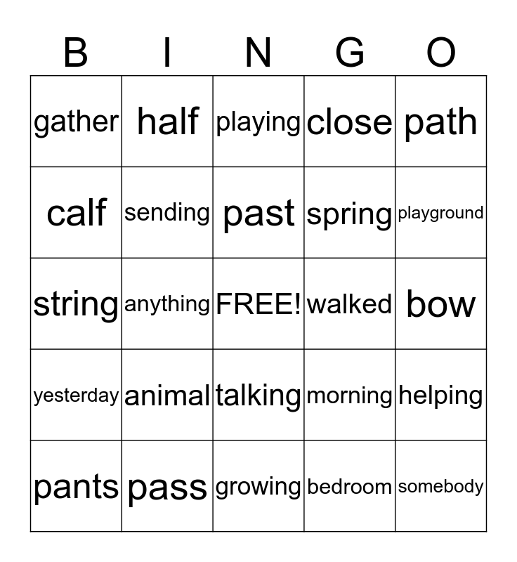 This bingo card has a free space and 24 words: animal, pass, past, pants, path, gather, calf, half, walked, talking, spring, string, morning, helping, sending, bedroom, bow, playing, playground, anything, somebody, yesterday, close and growing.