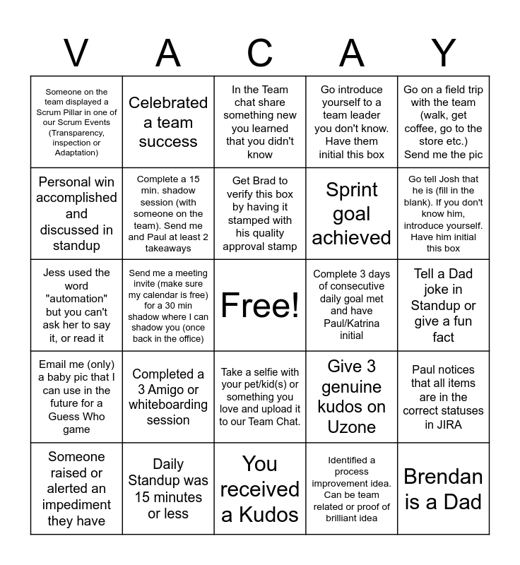 This bingo card has a free space and 24 words: Completed a 3 Amigo or whiteboarding session, Daily Standup was 15 minutes or less, Get Brad to verify this box by having it stamped with his quality approval stamp, Someone raised or alerted an impediment they have, Go on a field trip with the team (walk, get coffee, go to the store etc.) Send me the pic, Someone on the team displayed a Scrum Pillar in one of our Scrum Events (Transparency, inspection or Adaptation), Personal win accomplished and discussed in standup, Celebrated a team success, Complete 3 days of consecutive daily goal met and have Paul/Katrina initial, Take a selfie with your pet/kid(s) or something you love and upload it to our Team Chat., Sprint goal achieved, Jess used the word "automation" but you can't ask her to say it, or read it, Give 3 genuine kudos on Uzone, Paul notices that all items are in the correct statuses in JIRA, Complete a 15 min. shadow session (with someone on the team). Send me and Paul at least 2 takeaways, Identified a process improvement idea. Can be team related or proof of brilliant idea, Tell a Dad joke in Standup or give a fun fact, In the Team chat share something new you learned that you didn't know, Go tell Josh that he is (fill in the blank). If you don't know him, introduce yourself. Have him initial this box, Send me a meeting invite (make sure my calendar is free) for a 30 min shadow where I can shadow you (once back in the office), Brendan is a Dad, Email me (only) a baby pic that I can use in the future for a Guess Who game, Go introduce yourself to a team leader you don't know. Have them initial this box and You received a Kudos.