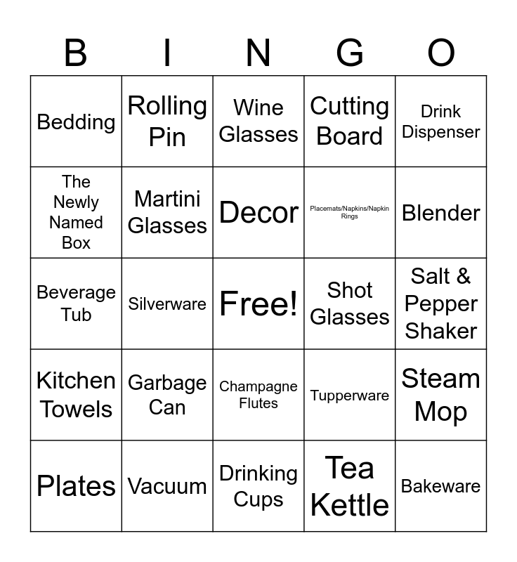 This bingo card has a free space and 30 words: Vacuum, Toaster, Silverware, Knives, Bedding, Wine Glasses, Martini Glasses, Champagne Flutes, Shot Glasses, Drinking Cups, Salt & Pepper Shaker, Bakeware, Tea Kettle, Mugs, Blender, Coffee Maker or Espresso Maker, Tupperware, Kitchen Towels, Garbage Can, Drink Dispenser, Beverage Tub, Cake Knife & Server, Rolling Pin, Placemats/Napkins/Napkin Rings, The Newly Named Box, Cutting Board, Steam Mop, Plates, Decor and Charcuterie Board/Accessories.
