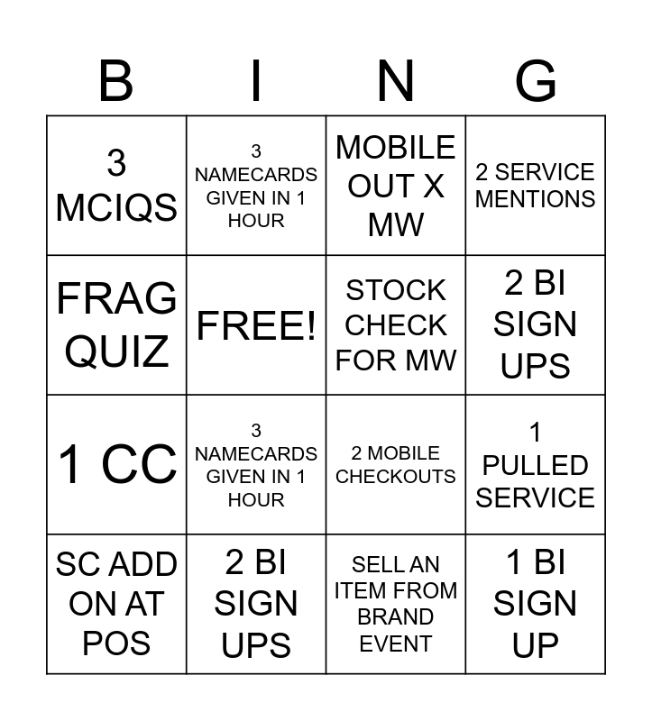 This bingo card has 16 words: 2 BI SIGN UPS, 1 PULLED SERVICE, MOBILE OUT X MW, 3 MCIQS, 1 CC, 3 NAMECARDS GIVEN IN 1 HOUR, 2 MOBILE CHECKOUTS, SELL AN ITEM FROM BRAND EVENT, FRAG QUIZ, FREE!, SC ADD ON AT POS, 2 SERVICE MENTIONS, 3 NAMECARDS GIVEN IN 1 HOUR, 2 BI SIGN UPS, STOCK CHECK FOR MW and 1 BI SIGN UP.