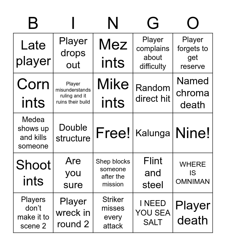 This bingo card has a free space and 24 words: Are you sure, Player wreck in round 2, Mike ints, Players don’t make it to scene 2, Player forgets to get reserve, Late player, Corn ints, Player drops out, Kalunga, Shep blocks someone after the mission, Random direct hit, Medea shows up and kills someone, Flint and steel, WHERE IS OMNIMAN, Player misunderstands ruling and it ruins their build, I NEED YOU SEA SALT, Nine!, Mez ints, Named chroma death, Double structure, Player death, Shoot ints, Player complains about difficulty and Striker misses every attack.