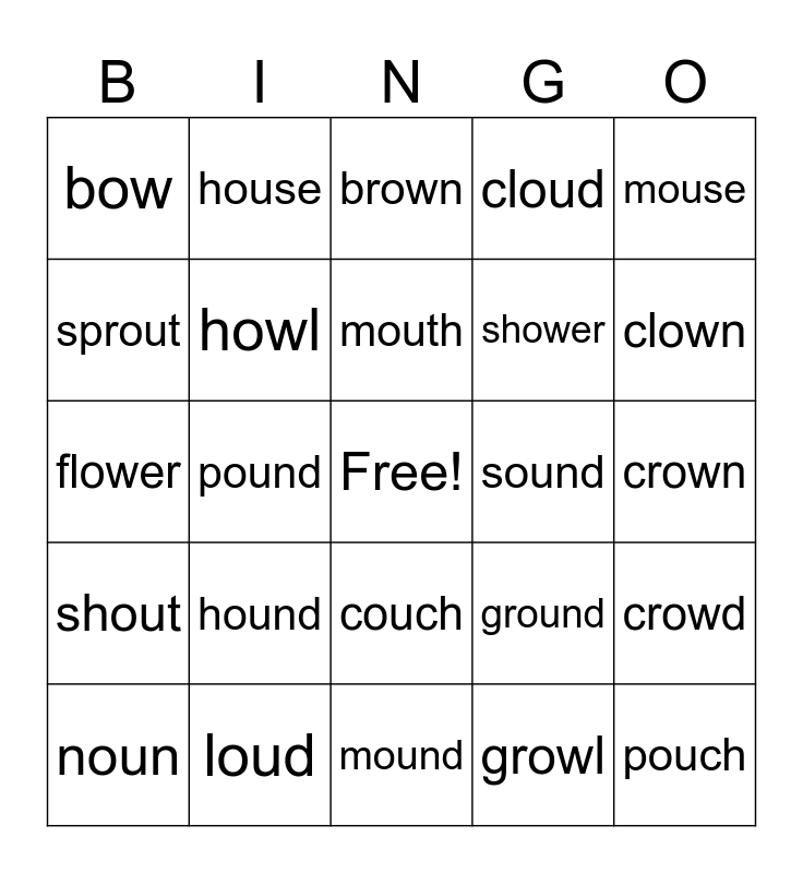 This bingo card has a free space and 24 words: hound, loud, mouth, noun, mouse, bow, sprout, house, sound, couch, shower, flower, ground, crowd, howl, growl, crown, brown, clown, pound, pouch, shout, cloud and mound.