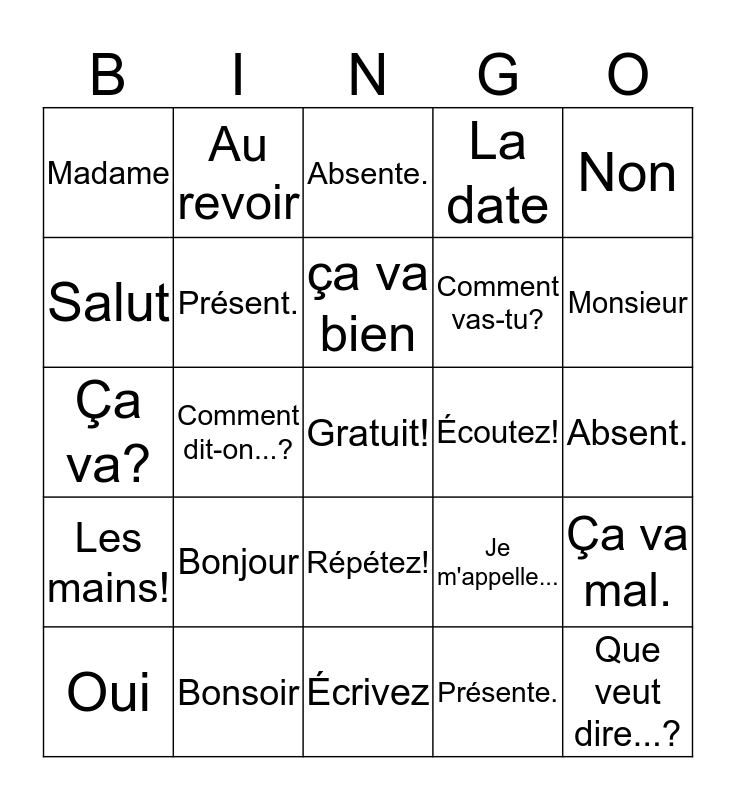 This bingo card has a free space and 24 words: Bonjour, Bonsoir, ça va bien, Oui, Non, Madame, Salut, Au revoir, Écoutez!, Répétez!, Comment vas-tu?, Ça va?, Je m'appelle..., Ça va mal., Présent., Présente., Absent., Absente., Monsieur, Comment dit-on...?, Que veut dire...?, Les mains!, La date and Écrivez.