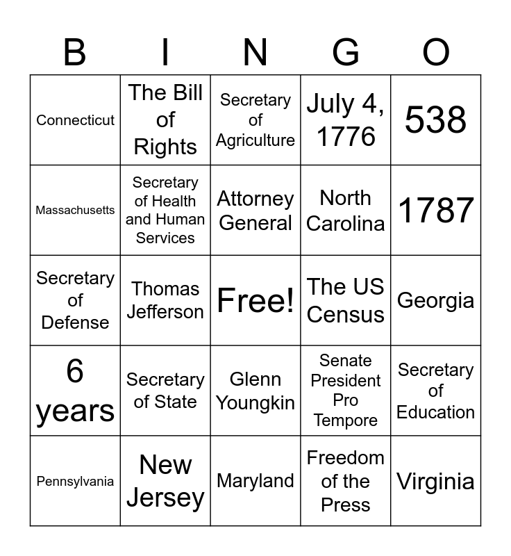 This bingo card has a free space and 54 words: 27, 6 years, 2 years, Supreme Court of the United States, Glenn Youngkin, 19th amendment, July 4, 1776, New Hampshire, Massachusetts, Rhode Island, Connecticut, New York, New Jersey, Pennsylvania, Delaware, Maryland, Virginia, North Carolina, South Carolina, Georgia, Senate President Pro Tempore, Life, The US Census, 538, We the People, The Bill of Rights, Freedom of Speech, Freedom of Religion, Freedom of Assembly, Freedom of the Press, Freedom to Petition the Government, Checks and balances, Separation of powers, 535, Secretary of Agriculture, Secretary of Commerce, Secretary of Defense, Secretary of Education, Secretary of Energy, Secretary of Health and Human Services, Secretary of Homeland Security, Secretary of Housing and Urban Development, Secretary of the Interior, Secretary of Labor, Secretary of State, Secretary of Transportation, Secretary of the Treasury, Secretary of Veterans Affairs, Attorney General, Thomas Jefferson, 1787, The Federalist Papers, Louisiana and Franklin Roosevelt.