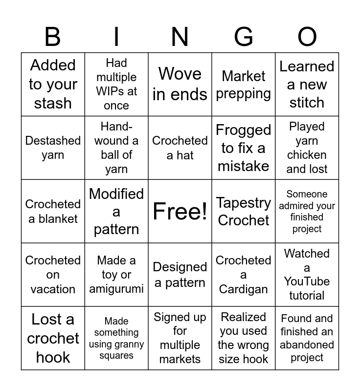This bingo card has a free space and 24 words: Made a toy or amigurumi, Made something using granny squares, Crocheted a hat, Lost a crochet hook, Learned a new stitch, Added to your stash, Destashed yarn, Had multiple WIPs at once, Tapestry Crochet, Designed a pattern, Frogged to fix a mistake, Crocheted a blanket, Crocheted a Cardigan, Watched a YouTube tutorial, Hand-wound a ball of yarn, Realized you used the wrong size hook, Someone admired your finished project, Wove in ends, Played yarn chicken and lost, Modified a pattern, Found and finished an abandoned project, Crocheted on vacation, Market prepping and Signed up for multiple markets.