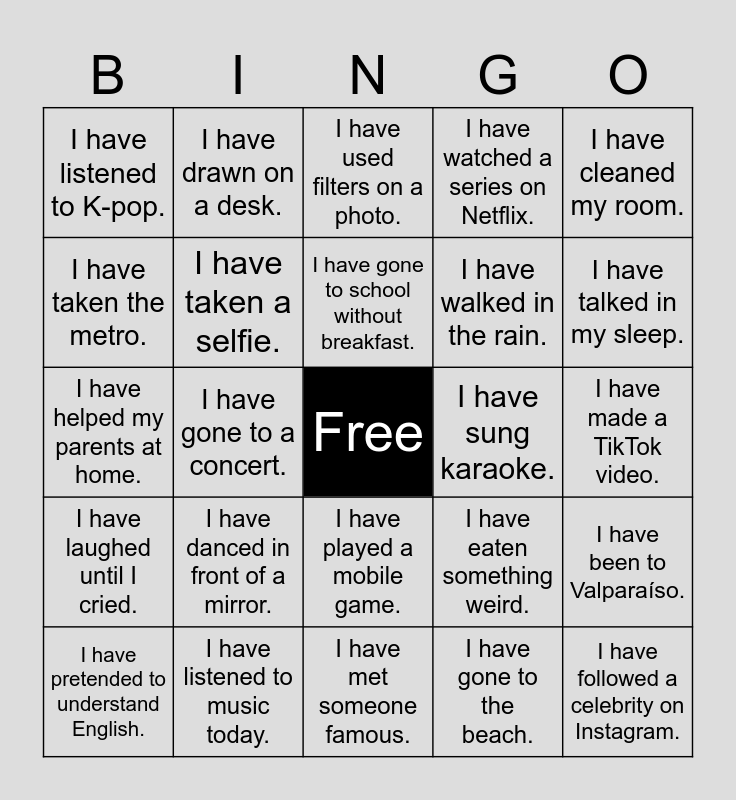 This bingo card has a free space and 40 words: I have made a sandwich., I have helped my parents at home., I have done my homework late at night., I have taken a selfie., I have listened to music today., I have played a mobile game., I have gone to school without breakfast., I have forgotten my school supplies., I have cleaned my room., I have laughed until I cried., I have gone to a concert., I have watched a series on Netflix., I have followed a celebrity on Instagram., I have made a TikTok video., I have sung karaoke., I have danced in front of a mirror., I have liked a meme., I have listened to K-pop., I have cried because of a movie., I have used filters on a photo., I have been to Valparaíso., I have gone to the beach., I have walked in the rain., I have taken the metro., I have visited another city., I have slept outside the house., I have gone camping., I have seen fireworks., I have visited a museum., I have been to a school event at night., I have made someone laugh during class., I have pretended to understand English., I have lost my keys or wallet., I have eaten something weird., I have talked in my sleep., I have met someone famous., I have had a strange dream., I have missed the bus., I have drawn on a desk. and I have worn mismatched socks..