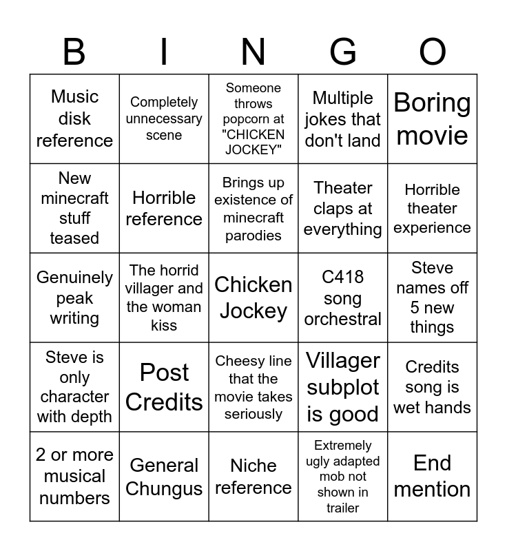 This bingo card has a free space and 29 words: 2 or more musical numbers, Herobrine, The horrid villager and the woman kiss, Genuinely good reference, Music disk reference, Someone throws popcorn at "CHICKEN JOCKEY", Horrible reference, Post Credits, C418 song orchestral, General Chungus, Steve names off 5 new things, End mention, Niche reference, Extremely ugly adapted mob not shown in trailer, Horrible theater experience, Cops show up, Cheesy line that the movie takes seriously, Steve is only character with depth, Boring movie, Genuinely peak writing, Villager subplot is good, Sequel tease, Theater claps at everything, New minecraft stuff teased, Multiple jokes that don't land, Completely unnecessary scene, Credits song is wet hands, Brings up existence of minecraft parodies and Steve has a good backstory.