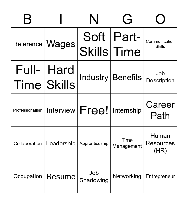 This bingo card has a free space and 30 words: Resume, Cover Letter, Interview, Portfolio, Reference, Soft Skills, Hard Skills, Apprenticeship, Internship, Job Shadowing, Career Path, Entrepreneur, Networking, Promotion, Job Description, Work Ethic, Time Management, Collaboration, Leadership, Communication Skills, Professionalism, Salary, Wages, Benefits, Full-Time, Part-Time, Human Resources (HR), Occupation, Industry and Workplace Safety.