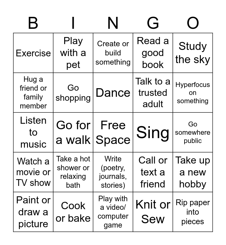This bingo card has a free space and 24 words: Paint or draw a picture, Take a hot shower or relaxing bath, Dance, Knit or Sew, Study the sky, Exercise, Play with a pet, Create or build something, Sing, Go somewhere public, Listen to music, Go shopping, Call or text a friend, Take up a new hobby, Hug a friend or family member, Cook or bake, Play with a video/ computer game, Read a good book, Hyperfocus on something, Watch a movie or TV show, Go for a walk, Write (poetry, journals, stories), Talk to a trusted adult and Rip paper into pieces.