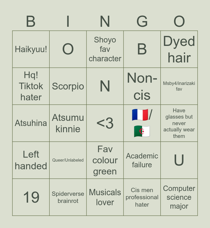 This bingo card has a free space and 29 words: 19, ENTP, Atsumu kinnie, Under 5'3(160cm), Haikyuu!, Shoyo fav character, Scorpio, Queer/Unlabeled, 🇫🇷/🇩🇿, Spiderverse brainrot, Have glasses but never actually wear them, Computer science major, Musicals lover, Cis men professional hater, Msby4/inarizaki fav, Multishipper, Fav colour green, Left handed, Dyed hair, Atsuhina, Academic failure, Cartoon shows lover, Non-cis, Hq! Tiktok hater, B, O, U, N and Z.
