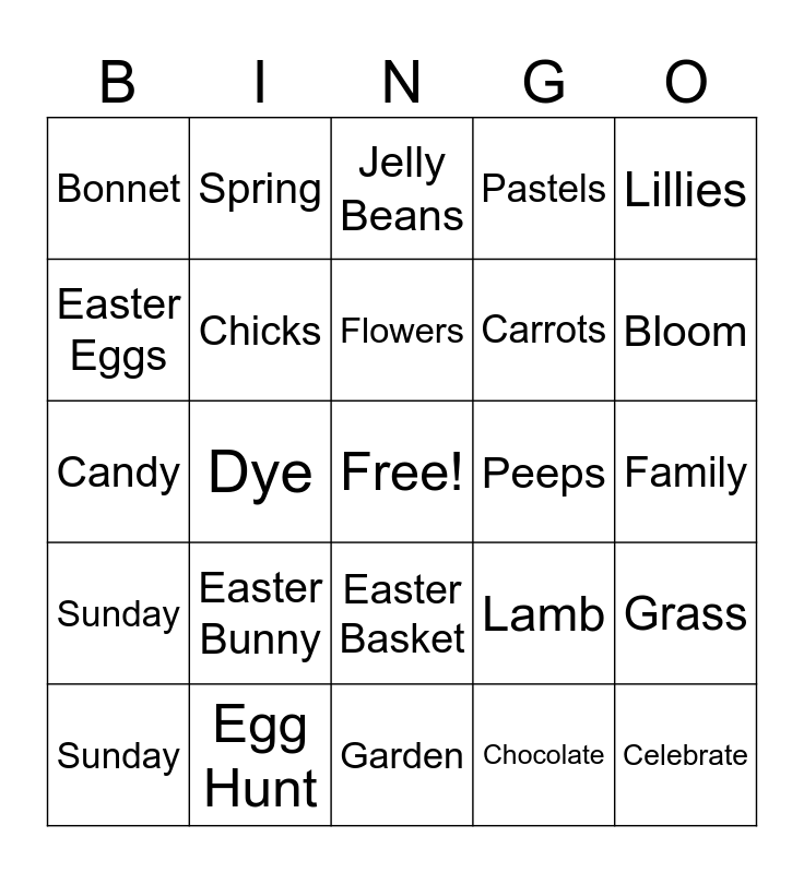 This bingo card has a free space and 24 words: Easter Bunny, Egg Hunt, Flowers, Sunday, Lillies, Bonnet, Easter Eggs, Spring, Peeps, Easter Basket, Carrots, Candy, Lamb, Grass, Chicks, Chocolate, Family, Jelly Beans, Bloom, Dye, Celebrate, Sunday, Pastels and Garden.