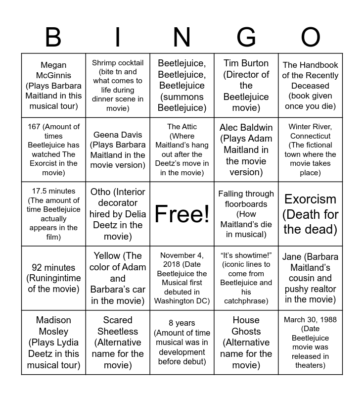 This bingo card has a free space and 45 words: Netherworld (The afterlife, where ghosts go after death), March 30, 1988 (Date Beetlejuice movie was released in theaters), Sandworms (Worm-like creatures, eat dead and undead in the movie), Madison Mosley (Plays Lydia Deetz in this musical tour), Day-O (Themed cocktail tonight and movie dinner party scene song), House Ghosts (Alternative name for the movie), Beetlejuice, Beetlejuice, Beetlejuice (summons Beetlejuice), Will Burton (Plays Adam Maitland in this musical tour), The Handbook of the Recently Deceased (book given once you die), Scared Sheetless (Alternative name for the movie), Tim Burton (Director of the Beetlejuice movie), Falling through floorboards (How Maitland’s die in musical), November 4, 2018 (Date Beetlejuice the Musical first debuted in Washington DC), Yellow (The color of Adam and Barbara’s car in the movie), Justin Colette (Plays Beetlejuice in this musical tour), 8 years (Amount of time musical was in development before debut), Bio-exorcist (Beetlejuice’s job in the afterlife in the movie), 17.5 minutes (The amount of time Beetlejuice actually appears in the film), The Deetz Family (Family who inherits Maitland’s home after their death), Winter River, Connecticut (The fictional town where the movie takes place), Shrimp cocktail (bite tn and what comes to life during dinner scene in movie), Danny Elfman (The composer of the film’s score), Juno (The name of the caseworker assigned to the Maitland’s in the movie), Megan McGinnis (Plays Barbara Maitland in this musical tour), Oscar for best makeup & hairstyling (The original film won this award in 1989), Exorcism (Death for the dead), Car accident (The Maitland’s cause of death in the movie), Betelgeuse (star in constellation Orion, main character derived from this), “It’s showtime!” (iconic lines to come from Beetlejuice and his catchphrase), 92 minutes (Runingintime of the movie), Sculpture artist (Delia Deetz’s profession in the movie), Jane (Barbara Maitland’s cousin and pushy realtor in the movie), New York (Deetz’s came from here before moving to Maitland’s house in movie), Winona Ryder (Plays Lydia in the movie version of Beetlejuice), “The Afterlife” (newspaper Beetlejuice is reading in the cemetery in the movie), Otho (Interior decorator hired by Delia Deetz in the movie), Red (Color of Lydia’s wedding dress in the movie), Michael Keaton (Plays Beetlejuice in the movie version), Warner Bros (The company that distributed the original Beetlejuice movie), The Attic (Where Maitland’s hang out after the Deetz’s move in in the movie), 167 (Amount of times Beetlejuice has watched The Exorcist in the movie), Alec Baldwin (Plays Adam Maitland in the movie version), Snake (The animal Beetlejuice turns into about halfway through the movie), Geena Davis (Plays Barbara Maitland in the movie version) and Black and White stripes (The color and pattern of Beetlejuice’s outfit).
