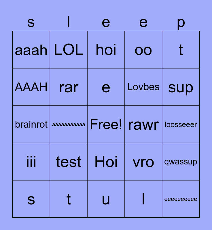 This bingo card has a free space and 24 words: test, t, e, s, t, aaah, AAAH, LOL, rawr, Hoi, Lovbes, brainrot, vro, qwassup, rar, l, loosseeer, hoi, sup, aaaaaaaaaaa, eeeeeeeeee, iii, oo and u.
