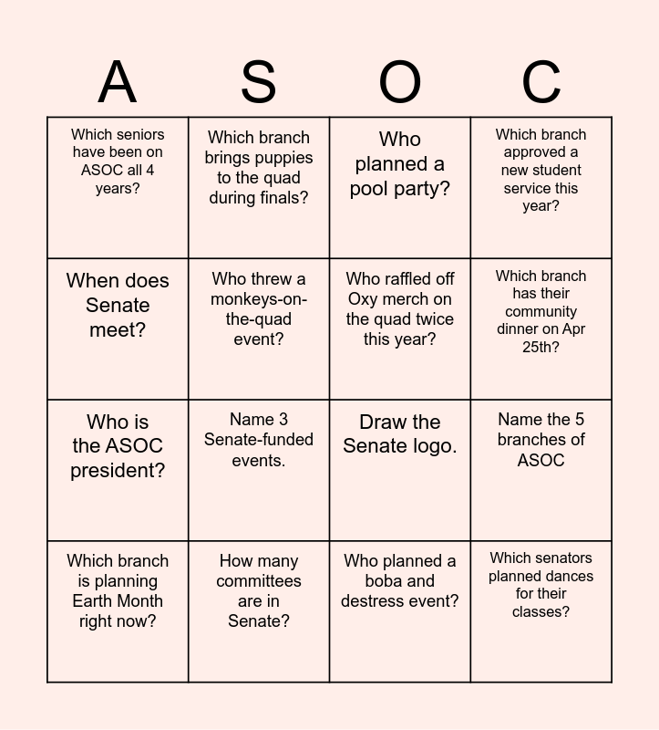 This bingo card has 16 words: How many committees are in Senate?, Name the 5 branches of ASOC, Who planned a pool party?, Which seniors have been on ASOC all 4 years?, Who is the ASOC president?, Which branch brings puppies to the quad during finals?, Draw the Senate logo., Who planned a boba and destress event?, When does Senate meet?, Who threw a monkeys-on-the-quad event?, Which branch is planning Earth Month right now?, Which branch approved a new student service this year?, Name 3 Senate-funded events., Which branch has their community dinner on Apr 25th?, Who raffled off Oxy merch on the quad twice this year? and Which senators planned dances for their classes?.