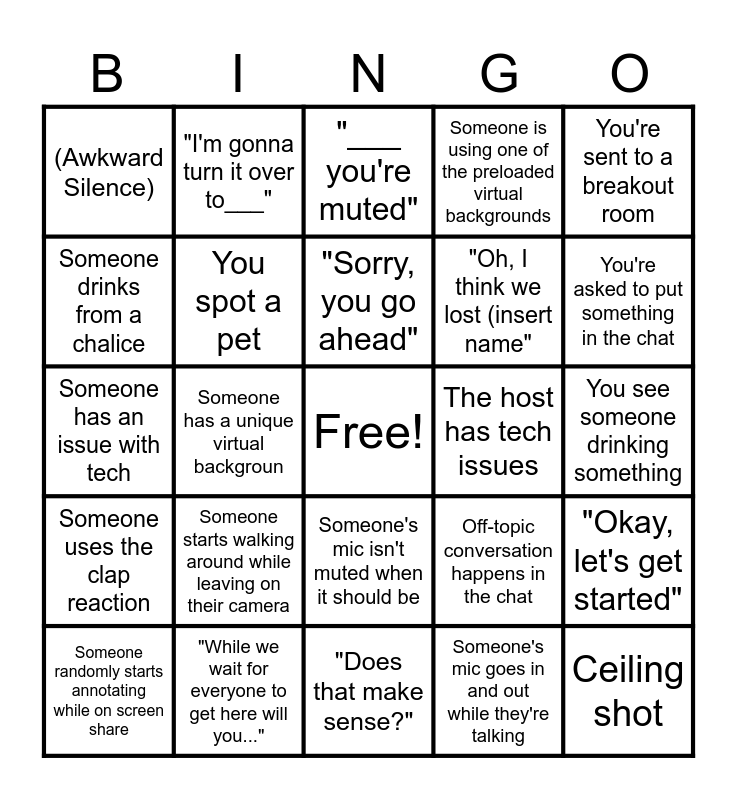 This bingo card has a free space and 40 words: The start of the meeting has to be redone because the presenter was muted, Someone has an issue with tech, Dad joke is told, You spot a pet, "While we wait for everyone to get here will you...", Someone's mic isn't muted when it should be, "Sorry, you go ahead", Everyone gets kicked out of the breakout rooms prematurely, You're sent to a breakout room, Someone uses the clap reaction, Someone has a unique virtual backgroun, Someone is using one of the preloaded virtual backgrounds, Ceiling shot, You see someone drinking something, The host has tech issues, Someone starts walking around while leaving on their camera, Someone is eating on camera, (Awkward Silence), "Can you hear me now?", "___ you're muted", "Okay, let's get started", Someone's mic goes in and out while they're talking, "Oh, I think we lost (insert name", Someone drinks from a chalice, "Next slide please", Something won't load, Meeting starts with a Poll, Meeting ends with a poll, Poll Everywhere or Menti is used, Person talking has connection issues, "Can y'all hear that?", Someone randomly starts annotating while on screen share, "It's good to 'see' everyone", Off-topic conversation happens in the chat, You're asked to put something in the chat, "Does that make sense?", You see someone talking while on mute, A link is put in the chat, "I'm gonna turn it over to___" and You hear an echo.