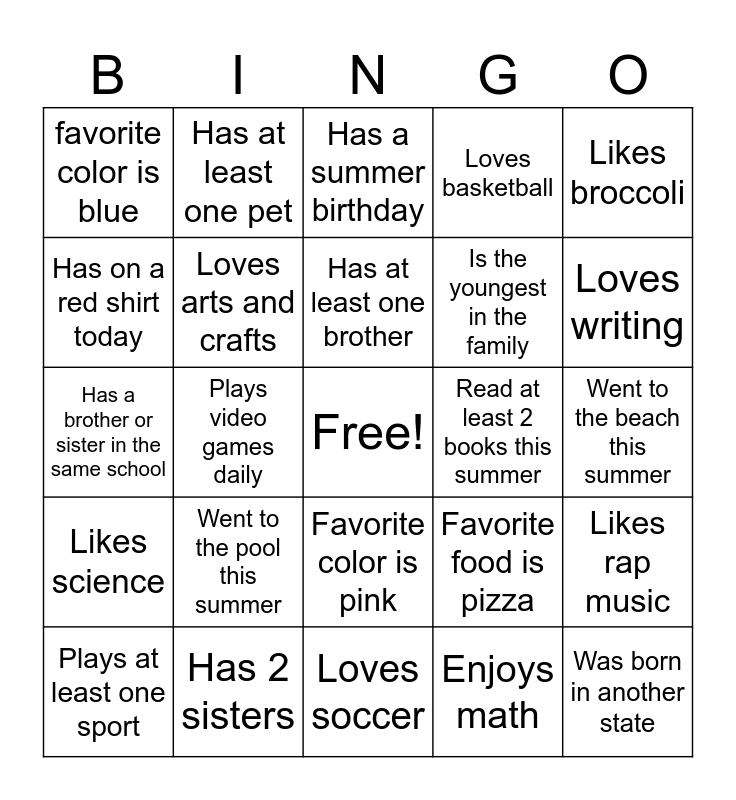 This bingo card has a free space and 24 words: Went to the pool this summer, Has 2 sisters, Has at least one brother, Plays at least one sport, Likes broccoli, favorite color is blue, Has on a red shirt today, Has at least one pet, Read at least 2 books this summer, Favorite color is pink, Is the youngest in the family, Has a brother or sister in the same school, Favorite food is pizza, Likes rap music, Loves arts and crafts, Enjoys math, Went to the beach this summer, Has a summer birthday, Loves writing, Plays video games daily, Was born in another state, Likes science, Loves basketball and Loves soccer.
