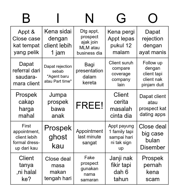 This bingo card has a free space and 24 words: Prospek ghost kau, Close deal masa makan tengah hari, Bagi presentation dalam kereta, Client tanya ,ni halal ke?, Dapat rejection dengan ayat manis, Appt & Close case kat tempat yang pelik, Dapat referral dari saudara-mara client, Kena sidai dengan client lebih 1 jam, Client cerita masalah cinta dia, Appointment last minute sangat, Client suruh compare coverage company lain, Prospek cakap harga mahal, Appt payung 1 family tapi sampai hari ni tak sign up, Close deal big case bulan Disember, Dapat rejection sebab "Agent baru atau Part time", Janji nak fikir tapi dah 6 tahun, Dapat client atau prospect kat dating apps, Dtg appt, prospect ajak join MLM atau business dia, Follow up dengan client tapi client nak pinjam duit, Jumpa prospek bawa anak, Prospek pernah kena scam, First appointment, client lebih formal dress-up dari kau, Kena pergi Appt lepas pukul 12 malam and Fake prospect gunakan nama samaran.