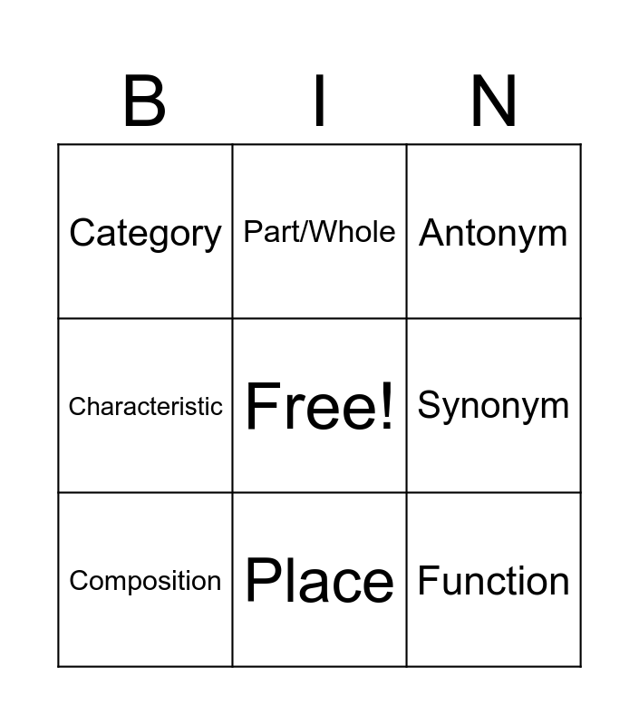This bingo card has a free space and 8 words: Synonym, Antonym, Part/Whole, Composition, Category, Function, Characteristic and Place.