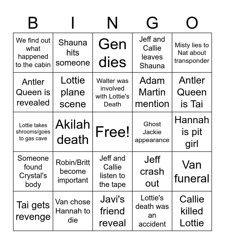 This bingo card has a free space and 24 words: Robin/Britt become important, Van chose Hannah to die, Walter was involved with Lottie's Death, Tai gets revenge, Misty lies to Nat about transponder, We find out what happened to the cabin, Antler Queen is revealed, Shauna hits someone, Ghost Jackie appearance, Jeff and Callie listen to the tape, Adam Martin mention, Lottie takes shrooms/goes to gas cave, Jeff crash out, Van funeral, Lottie plane scene, Lottie's death was an accident, Hannah is pit girl, Gen dies, Antler Queen is Tai, Akilah death, Callie killed Lottie, Someone found Crystal's body, Jeff and Callie leaves Shauna and Javi's friend reveal.