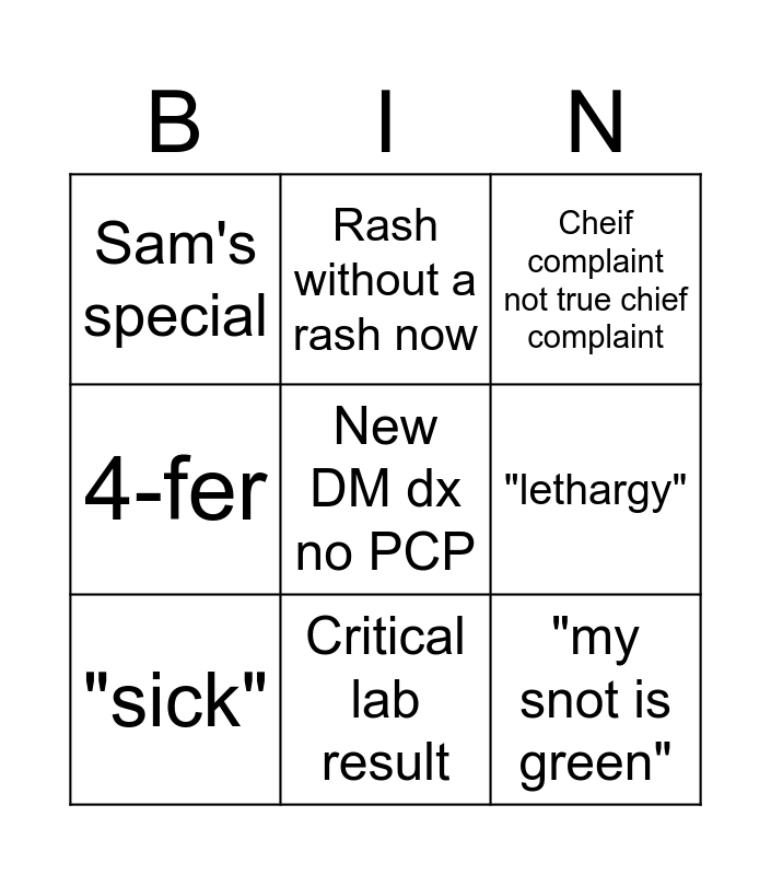 This bingo card has a free space and 52 words: 3-fer, Needs note, Pt talking nonstop in auscultation, Tooth infection, "infection's going into my lungs", "I took a picture", Rash without a rash now, Drinking water/juice for UA, "lethargy", Prior auth, "sick", last minute x ray or lac, feared complaint without dx, "severe" pain, "ongoing cough", work comp, Critical lab result, COM cor, Overbearing partner/parent, "my snot is green", "spider bite", Bacon special, Sam's special, I have skilled nursing orders to be filled out, Waiting room playground, Alcohol related injury, Cab's here!, I just want a referral, Wants test, no symptoms, Med refill, Dizzy elderly, 4-fer, Cat bite, "don't have time to be sick", "prophylactic antibiotic plz", Cheif complaint not true chief complaint, Patient wants female provider, Positive home pregnancy test, STI concern, "swallowing razor blades", Hospital f/u, Air freshener needed, Syncope waiting room, "oh, by the way...", "needle phobia", Bring in own sample, Worms in stool, googled symptoms, Life hx, therapeutic X ray, No show that shows and Tissue/baggy.