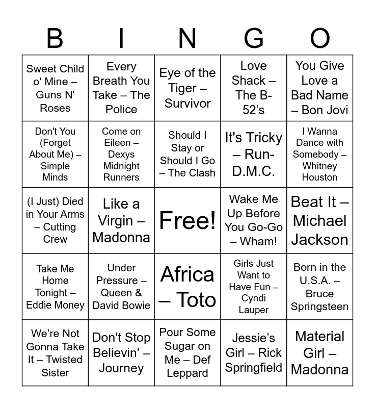 This bingo card has a free space and 30 words: Don't Stop Believin' – Journey, Billie Jean – Michael Jackson, Like a Virgin – Madonna, Livin’ on a Prayer – Bon Jovi, Sweet Child o' Mine – Guns N' Roses, Eye of the Tiger – Survivor, Come on Eileen – Dexys Midnight Runners, Africa – Toto, Wake Me Up Before You Go-Go – Wham!, Pour Some Sugar on Me – Def Leppard, Beat It – Michael Jackson, Material Girl – Madonna, Jessie’s Girl – Rick Springfield, Summer of '69 – Bryan Adams, I Wanna Dance with Somebody – Whitney Houston, Never Gonna Give You Up – Rick Astley, Girls Just Want to Have Fun – Cyndi Lauper, Take Me Home Tonight – Eddie Money, Under Pressure – Queen & David Bowie, You Give Love a Bad Name – Bon Jovi, (I Just) Died in Your Arms – Cutting Crew, The Final Countdown – Europe, Every Breath You Take – The Police, It's Tricky – Run-D.M.C., Don't You (Forget About Me) – Simple Minds, Love Shack – The B-52’s, Born in the U.S.A. – Bruce Springsteen, We’re Not Gonna Take It – Twisted Sister, Should I Stay or Should I Go – The Clash and Heaven Is a Place on Earth – Belinda Carlisle.