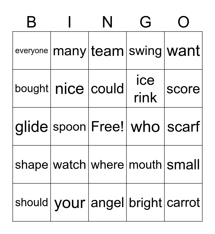 This bingo card has a free space and 24 words: watch, your, could, should, want, everyone, bought, many, who, where, ice rink, glide, mouth, small, nice, bright, scarf, team, score, spoon, carrot, shape, swing and angel.