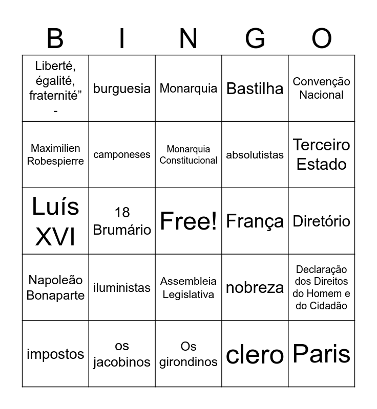 This bingo card has a free space and 24 words: impostos, iluministas, Monarquia Constitucional, clero, Convenção Nacional, Liberté, égalité, fraternité” -, burguesia, Monarquia, França, Diretório, Luís XVI, camponeses, nobreza, Declaração dos Direitos do Homem e do Cidadão, Maximilien Robespierre, os jacobinos, Os girondinos, Bastilha, Terceiro Estado, Napoleão Bonaparte, 18 Brumário, Assembleia Legislativa, absolutistas and Paris.