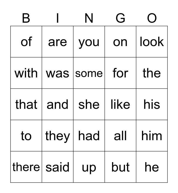 This bingo card has a free space and 24 words: they, said, some, there, look, of, with, are, like, had, for, that, all, him, was, but, his, you, the, and, he, to, on and up.