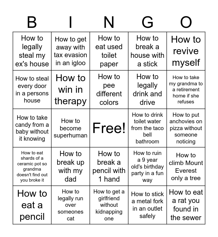 This bingo card has a free space and 24 words: How to break up with my dad, How to legally run over someones cat, How to pee different colors, How to eat a pencil, How to revive myself, How to legally steal my ex's house, How to steal every door in a persons house, How to get away with tax evasion in an igloo, How to drink toilet water from the taco bell bathroom, How to break a pencil with 1 hand, How to legally drink and drive, How to take candy from a baby without it knowing, How to ruin a 9 year old's birthday party in a fun way, How to climb Mount Everest only a tree, How to win in therapy, How to stick a metal fork in an outlet safely, How to put anchovies on pizza without someone noticing, How to eat used toilet paper, How to take my grandma to a retirement home if she refuses, How to become superhuman, How to eat a rat you found in the sewer, How to eat shards of a ceramic pot so grandma doesn't find out you broke it, How to break a house with a stick and How to get a girlfriend without kidnapping one.