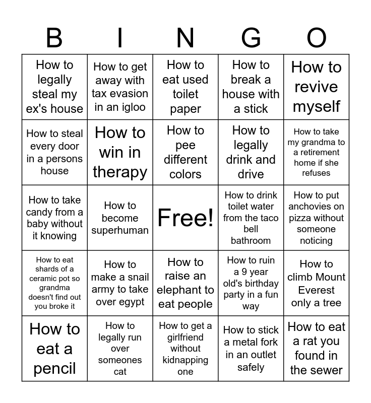 This bingo card has a free space and 24 words: How to make a snail army to take over egypt, How to legally run over someones cat, How to pee different colors, How to eat a pencil, How to revive myself, How to legally steal my ex's house, How to steal every door in a persons house, How to get away with tax evasion in an igloo, How to drink toilet water from the taco bell bathroom, How to raise an elephant to eat people, How to legally drink and drive, How to take candy from a baby without it knowing, How to ruin a 9 year old's birthday party in a fun way, How to climb Mount Everest only a tree, How to win in therapy, How to stick a metal fork in an outlet safely, How to put anchovies on pizza without someone noticing, How to eat used toilet paper, How to take my grandma to a retirement home if she refuses, How to become superhuman, How to eat a rat you found in the sewer, How to eat shards of a ceramic pot so grandma doesn't find out you broke it, How to break a house with a stick and How to get a girlfriend without kidnapping one.